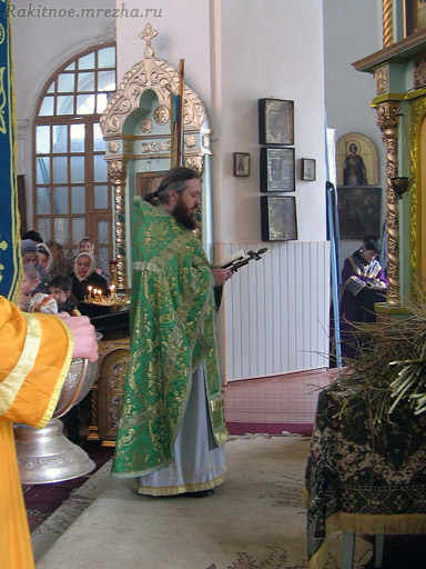настоятель игумен Никодим (Сылко). Красиво и торжественно в храме — запах свежей хвои и ладана, мерцание лампад, белые праздничные